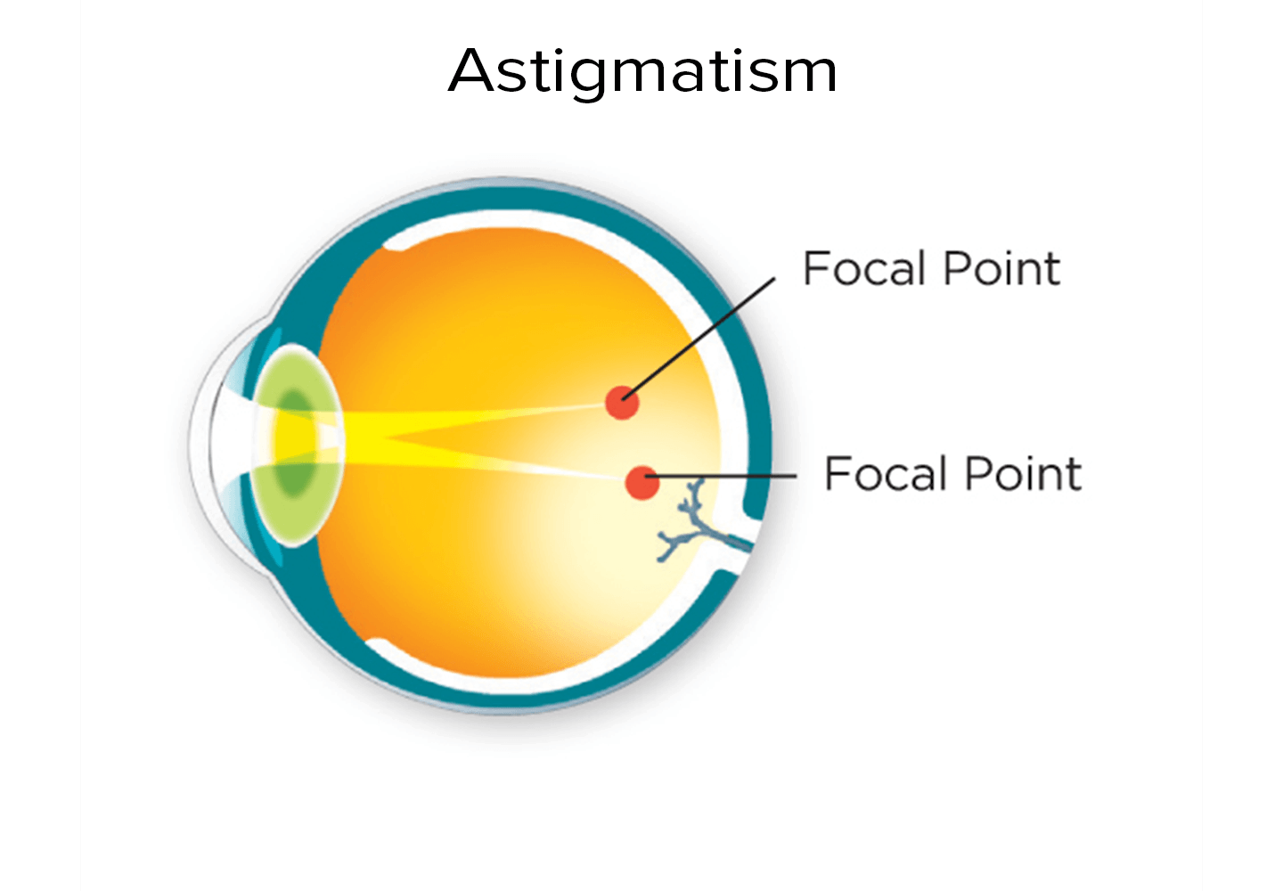 Astigmatism is caused when the curvature of the cornea or lens is arched in one axis and flatter in the opposite axis. Learn more about astigmatism here.
