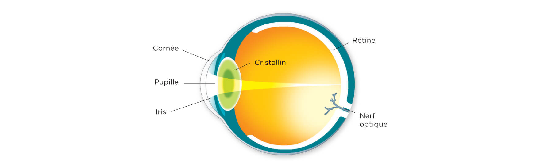 L’œil se compare à une caméra. Son segment antérieur est composé de deux lentilles naturelles : la cornée, située devant l’iris et le cristallin, situé derrière.